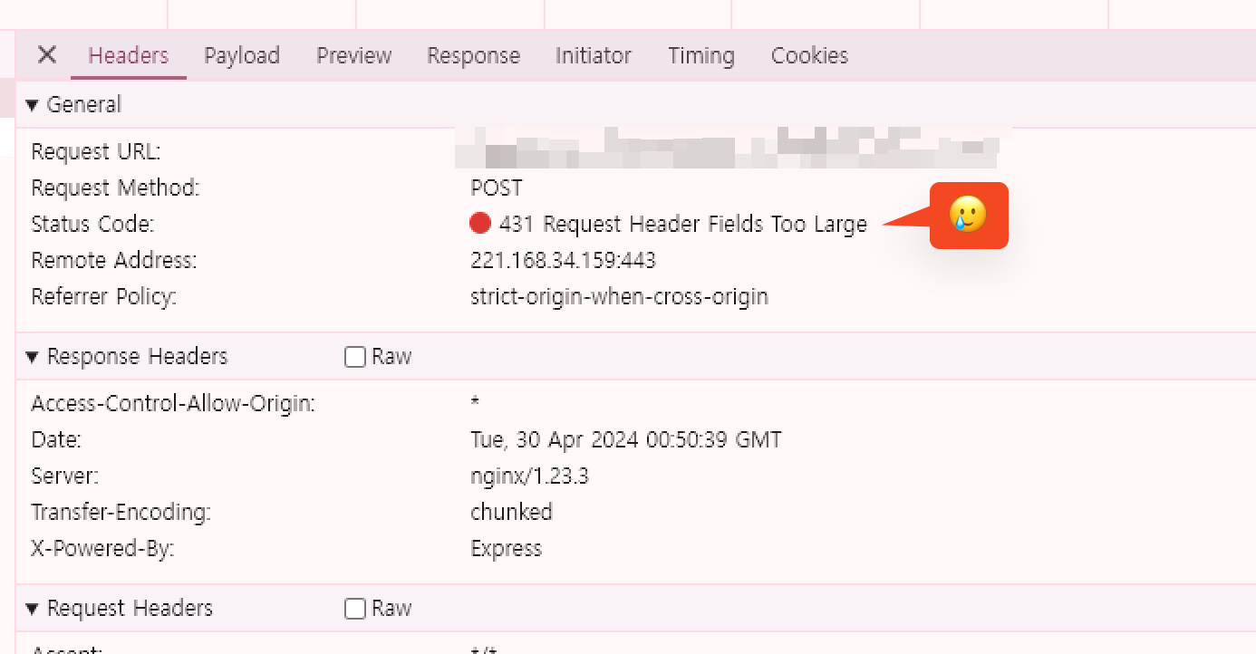 header가 길어져서 431 에러가 났던 것이다.