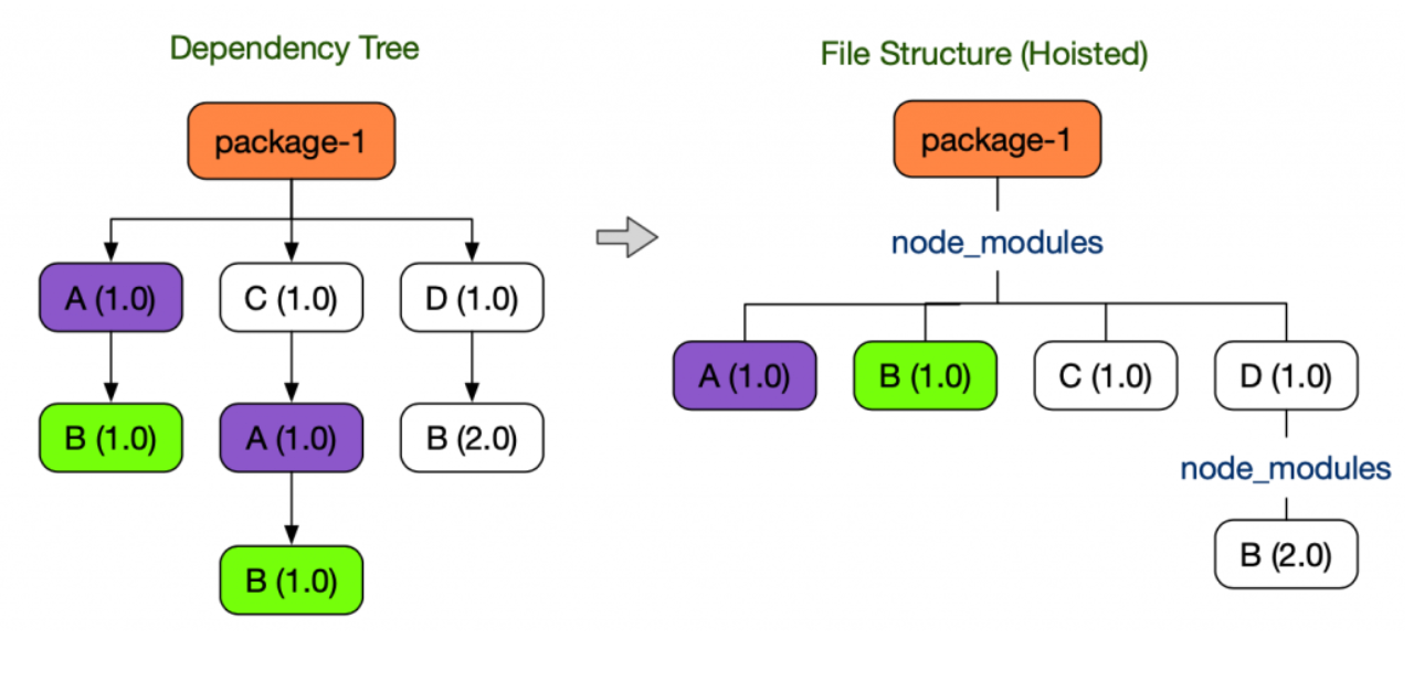 npm은 중복된 패키지 의존성을 최소화하여 공간을 절약하고 패키지 설치시간을 줄이기 위해 호이스팅을 일으키게 된다.