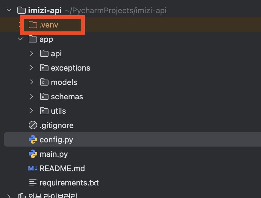다음 명령어를 실행하면 현재 디렉터리에 .venv 폴더가 생성된다. (맨 위 이미지 참고)