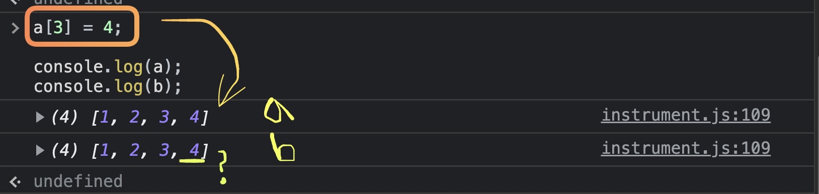 a의 3번째 자리에 4를 추가했는데, a와 b를 출력해보니 b 배열에도 4가 추가되었다!!