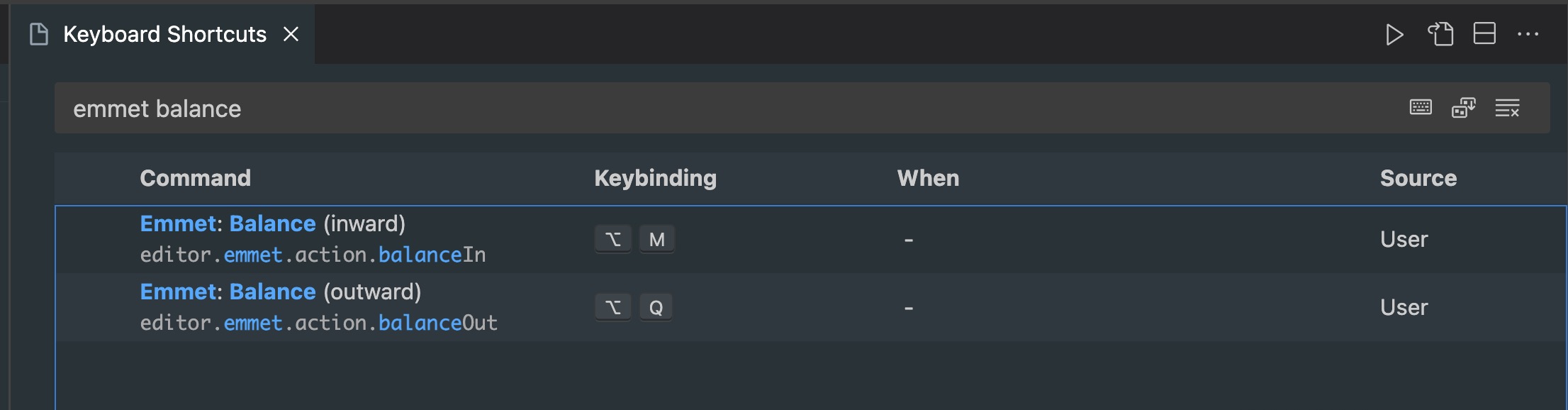 emmet balance 라고 단축키 검색하는 곳에 치면 2개가 나오는데 (outward) 부분을 내가 사용하기 편한 단축키로 바꿔준다.