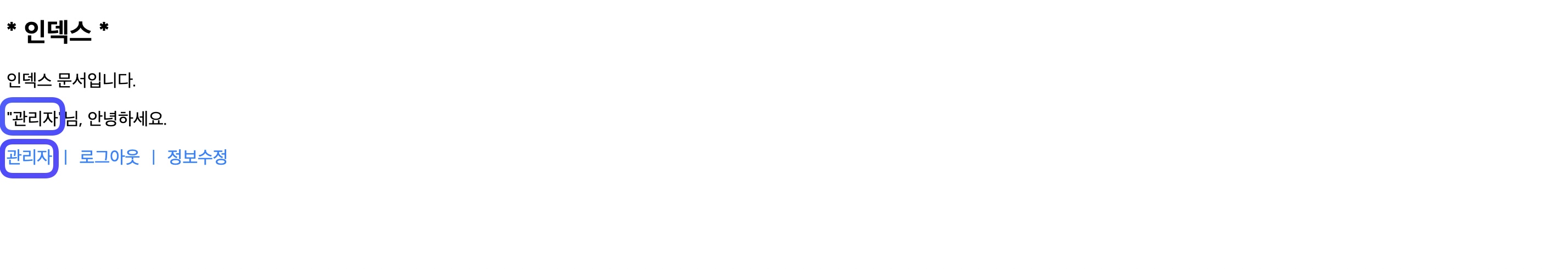 index.php 페이지에 관리자로 로그인 했을 때 관리자 링크가 보이게 끔 해놨다.