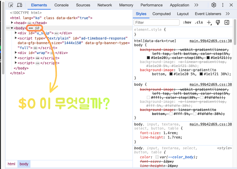 개발자 도구에서 요소 탭을 확인해 보면 $0이라고 연한 회색으로 표시되어있는 것을 확인해볼 수 있다.