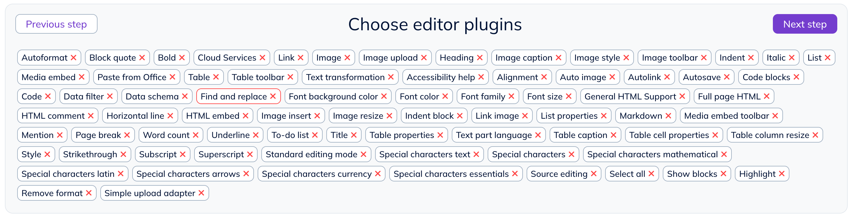 removePlugins: ["Heading", "Style", "Title"],